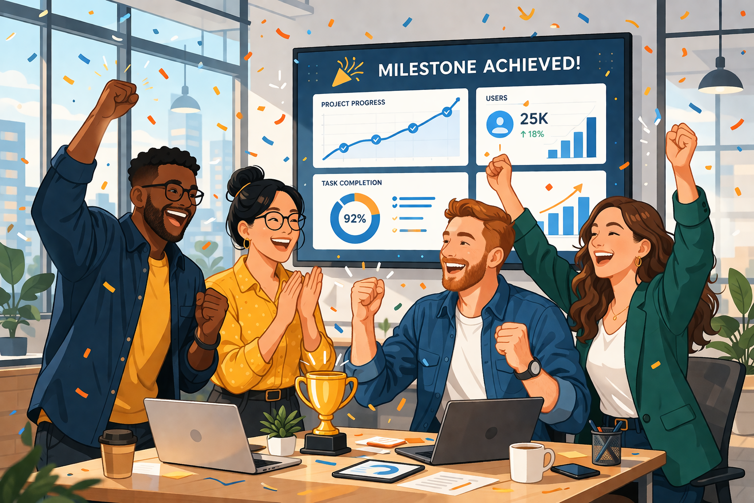 Hitput.com – Prompt ChatGPT AI: “Create an Image illustration of a team celebrating a milestone in a modern office with confetti and digital charts.”